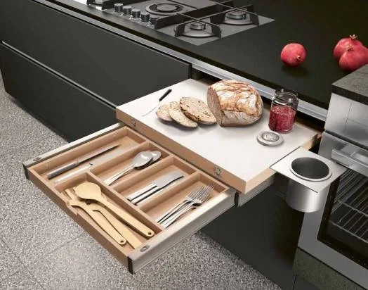 ​L’ergonomie a un prix. Les tiroirs coulissants (casseroliers) améliorent considérablement le confort d’utilisation mais sont plus coûteux que de simples étagères derrière des portes battantes.